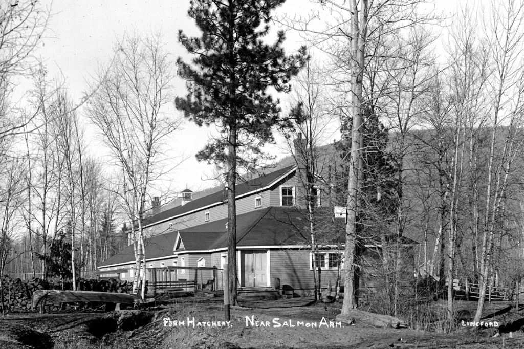 A government fish hatchery at Tappen, located at the mouth of Granite (Tappen) Creek. The Hatchery was established in 1901 and managed by Superintendent D.S. (Scotty) Mitchell until it was abandoned around 1916. Photo is by Rex Lingford, c. 1909 to 1914. (Photo courtesy of the Salmon Arm Museum at R.J. Haney Heritage Village)