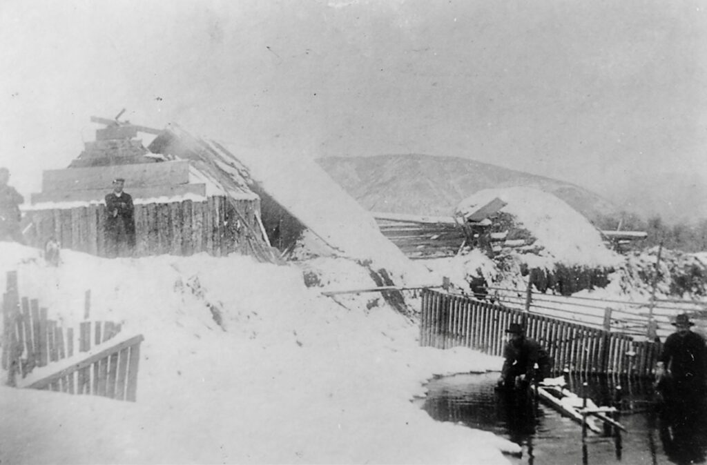 Winter work at the Shuswap Lake Dominion Government hatchery, Tappen BC, 1910, photo courtesy of the Salmon Arm Museum at R. J. Haney Heritage Village