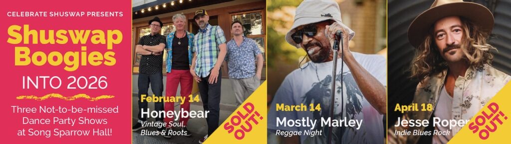After Ted Crouch, who had been producing some great concerts, and I heard about Salmon Arm’s new Song Sparrow music hall in 2020 we decided it was time to launch an organization to host concerts and dances. Thus, Celebrate Shuswap Society formed. We hosted our first show in 2022 and when Ted decided to pursue other interests, I took on the artist direction. Since then, we have hosted 17 fabulous shows, thanks to many generous sponsors and our very dedicated team of volunteers.