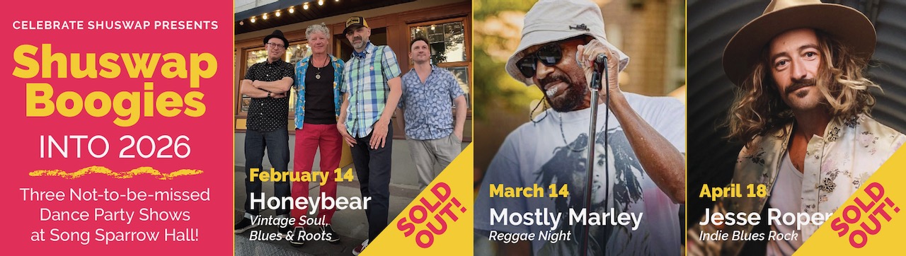 My fifty years of producing music shows has been just one of the unique ways that I volunteer my time to contribute to our community, which includes writing these columns. There is nothing like bringing joy to friends and audiences with great live music. I am always on the lookout for new bands, especially those who play some original tunes, as one of my goals is to never book the same band twice at each venue. Already this year is looking ever more successful, with two of the three upcoming Celebrate Shuswap shows, Honeybear and Jesse Roper, already sold out!