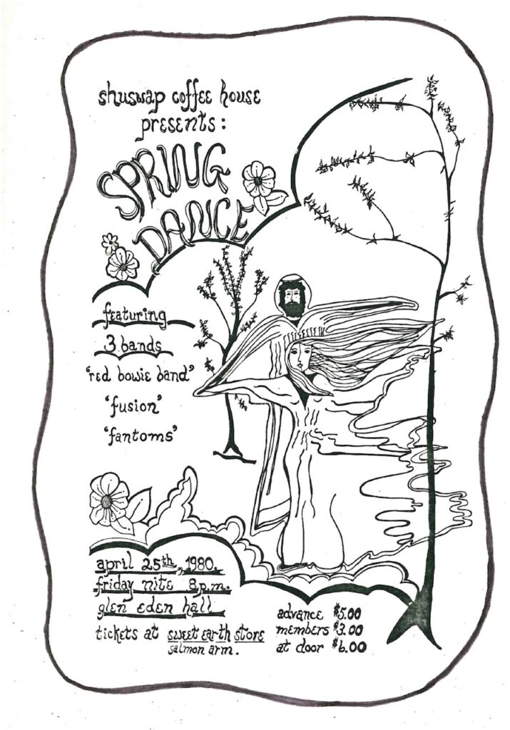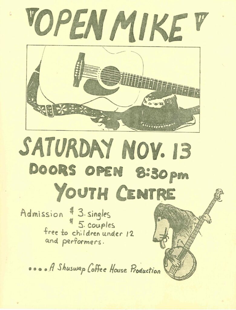 By 1982, audiences had begun to dwindle, and we ended our multi-year run with a reggae dance party at Gleneden. A few years ago, Jake and a new team revived the Shuswap Coffee House, which now sponsors an open mic at the Gleneden Hall on the third Saturday of the month.