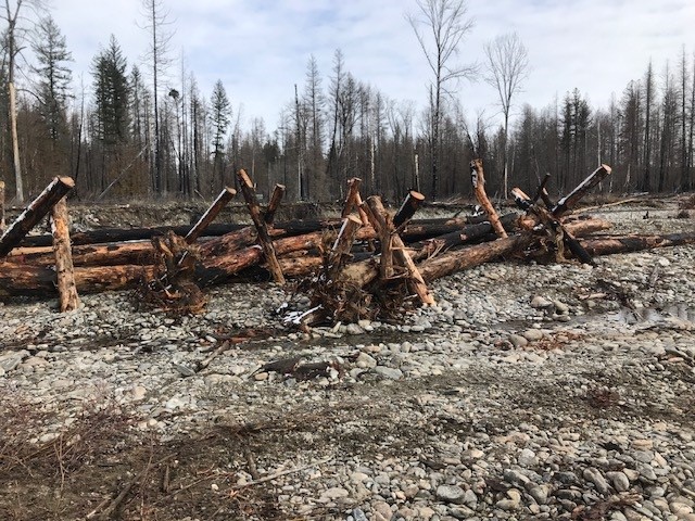 Individual PALS vary between 3 and 7 trees, 12 to 16 m in length with root wads and are anchored to the ground with angled wood posts, with one third of the trees buried. The LWS contain between 11 and 16 tree each and are secured with log piles. The goal is for these structures to improve habitat complexity and provide cover for fish, refugia for pre-spawn and juvenile salmon. As well, these structures will promote redistribution of river flows by creating multiple channels.