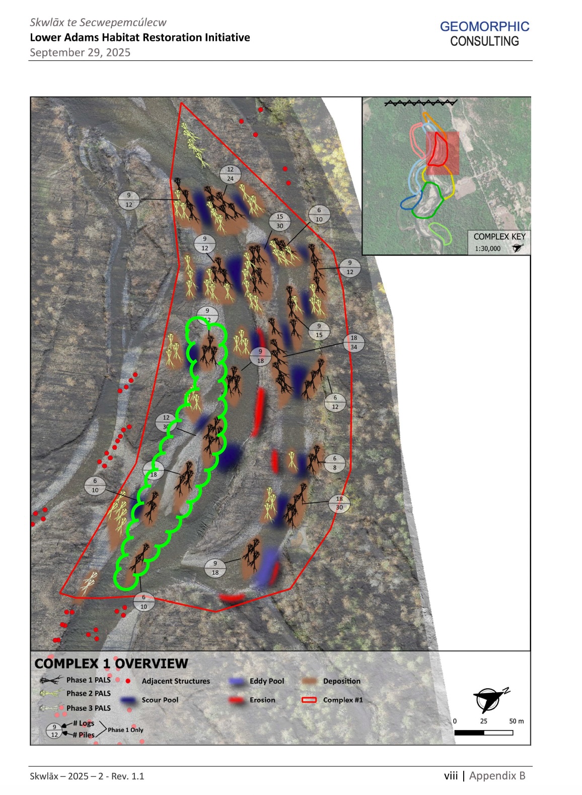 Consequently, the B.C. Salmon Restoration and Innovation Fund with 70 percent of the funding coming from the federal government and 30 percent from the province is being utilized to support a new Adams River restoration program to add large woody debris. In March, in collaboration with DFO and BC Parks, Skwlāx te Secwepemcúl̓ecw (SteS) completed Phase I of the new restoration project designed to counteract the structural starvation in the river and improve fluvial processes.