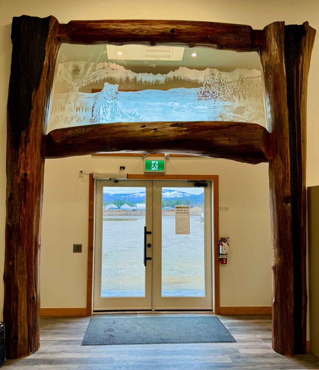 In the library’s interior, the finish work is also quite stunning, and includes what looks like solid posts and beams, but are roughly finished boards installed to resemble timbers. The pièce de résistance is the inside trim around the front door that incorporates burnt logs and an etched glass window with a design that illustrates a North Shuswap nature scene.